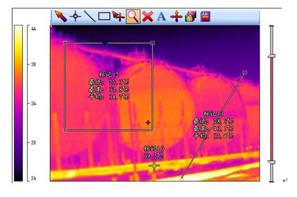 可以對熱像圖進行區(qū)域分析、點分析和線分析,實時顯示所選區(qū)域最高、最低和平均溫度,如圖所示: