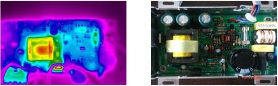 在電路研發(fā)過程中,可以除了常規(guī)的測試(如示波器、萬用表等)手段外,還可以用熱像儀對電路板進行檢測,通過顯示出的不同溫度點,對元器件所承受的電流,電壓等情況進行了解,工程師根據(jù)所檢測的溫度點,完善電路,提高轉(zhuǎn)換效率、減少功耗、減少電路內(nèi)部溫升,提高電路的可靠性。