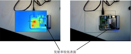 1 電路板上有部分器件(如電解電容頂面、電源模塊背面及其它芯片光潔面),其發(fā)射率比較低,所以檢測出的溫 度差異較大。在拍攝此類器件時,要將其表面用黑筆或黑漆涂黑,然后進行測溫等操作。
