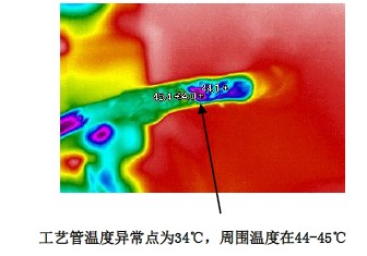 同時(shí)在管壁上發(fā)現(xiàn)溫度異常點(diǎn)處有油的存在,而別處沒有,估計(jì)是壓縮機(jī)用油,這樣工藝管焊接處泄漏的可能性較大。