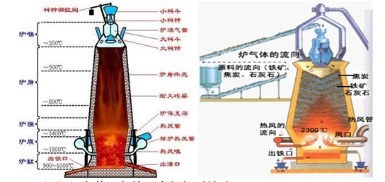 高爐是一種生產(chǎn)液態(tài)生鐵的鼓風(fēng)豎爐,它的形狀像一個(gè)筒。煉鐵的方法就是從爐頂加入礦石、焦炭和石灰石,從爐底部向爐內(nèi)通入加壓空氣,在焦炭燃燒時(shí),礦石、石灰石與焦炭一起發(fā)生反應(yīng),最終形成鐵水和爐渣。高爐的工作空間是用耐火材料砌筑而成的?,F(xiàn)代高爐爐型由爐缸、爐腹、爐腰、爐身和爐喉五段組成。其中爐缸、爐腰和爐喉呈圓筒形,爐腹呈倒錐臺(tái)形,爐身呈截錐臺(tái)形。