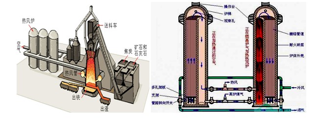 在高爐爐缸的上部沿爐子四周排列著十幾到幾十根鼓風(fēng)的管子,管子接到爐子的風(fēng)口,經(jīng)過預(yù)熱的空氣和噴入爐內(nèi)的燃料(如油或天然氣等),通過這些管子噴入爐內(nèi)。此時(shí)進(jìn)入爐內(nèi)的預(yù)熱空氣可達(dá)9001250攝氏度高溫,這樣的高溫氣體進(jìn)入爐內(nèi)后會(huì)與焦炭發(fā)生劇烈反應(yīng),生成煤氣(一氧化碳)同時(shí)沿爐子內(nèi)部上升,達(dá)到1650攝氏度,使?fàn)t料變成鐵水和渣。