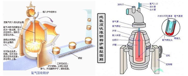 轉(zhuǎn)爐爐體用鋼板制成,呈圓筒形,內(nèi)襯耐火材料,吹煉時靠化學(xué)反應(yīng)熱加熱,不需外加熱源,是最重要的煉鋼設(shè)備,也可用于銅、鎳冶煉。轉(zhuǎn)爐按爐襯的耐火材料性質(zhì)分為堿性(用鎂砂或白云石為內(nèi)襯)和酸性(用硅質(zhì)材料為內(nèi)襯)轉(zhuǎn)爐;按氣體吹入爐內(nèi)的部位分為底吹、頂吹和側(cè)吹轉(zhuǎn)爐;按吹煉采用的氣體,分為空氣轉(zhuǎn)爐和氧氣轉(zhuǎn)爐。轉(zhuǎn)爐煉鋼主要是以液態(tài)生鐵為原料的煉鋼方法。其主要特點(diǎn)是:靠轉(zhuǎn)爐內(nèi)液態(tài)生鐵的物理熱和生鐵內(nèi)各組分(如碳、錳、硅、磷等)與送入爐內(nèi)的氧進(jìn)行化學(xué)反應(yīng)所產(chǎn)生的熱量,使金屬達(dá)到出鋼要求的成分和溫度。爐料主要為鐵水和造渣料(如石灰、石英、螢石等),為調(diào)整溫度,可加入廢鋼及少量的冷生鐵塊和礦石等。在轉(zhuǎn)爐煉鋼過程中,鐵水中的碳在高溫下和吹入的氧生成一氧化碳和少量二氧化碳的混合氣體,即轉(zhuǎn)爐煤氣。轉(zhuǎn)爐煤氣的發(fā)生量在一個冶煉過程中并不均衡,且成分也有變化,通常將轉(zhuǎn)爐多次冶煉過程回收的煤氣經(jīng)降溫、除塵,輸入儲氣柜,混勻后再輸送給用戶。