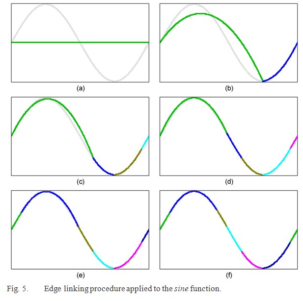 圖5顯示邊緣連接程序是如何運(yùn)用在正弦函數(shù)上的。第一步,設(shè)一條符合正弦函數(shù)的直線,然后這條線會(huì)在近似和正弦函數(shù)間最大的區(qū)別出現(xiàn)時(shí)被分解為兩個(gè)子分段(正弦波的最低值),在接下來(lái)的步驟中可以看出來(lái)每段都出現(xiàn)兩個(gè)新函數(shù)。接下來(lái)直到正弦函數(shù)正確安裝,短段才停止分裂。這種情況下,七段足夠了,就像看到的,每個(gè)組段都能精準(zhǔn)描述正弦函數(shù)的輪廓。