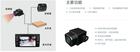 遠(yuǎn)紅外熱成像車載安全駕駛輔助系統(tǒng),主要用于車輛在黑夜漆黑環(huán)境、雨雪霧等惡劣天氣環(huán)境中輔助觀察目標(biāo),使駕駛員能夠在視距不足或眩暈強(qiáng)光中清晰地觀察到前方路面上的物體。