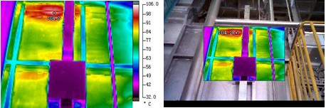 利用I系列紅外熱像儀對(duì)加熱爐表面進(jìn)行分區(qū)塊的檢測,并通過紅外分析軟件,對(duì)得到的熱圖像進(jìn)行溫度分布的分析。通過爐皮表面的不同變化,可以直接判斷有無內(nèi)襯缺陷。如果某部位拍攝的熱圖對(duì)比溫度明顯上升,可以認(rèn)定爐內(nèi)襯已有損壞侵蝕。
